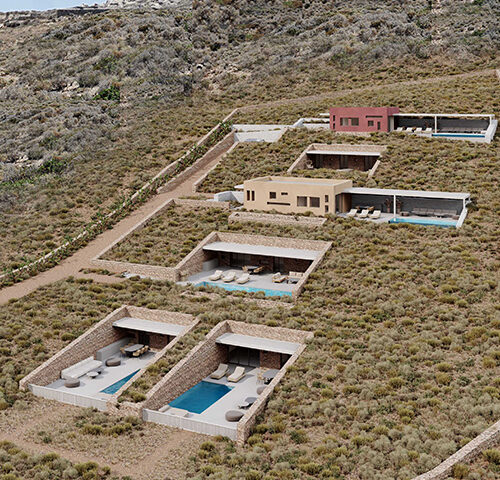 In the Mavromouri area of Milos, Human Point is undertaking the construction of five independent ground-level residences with both above-ground and semi-underground sections. The development is designed to integrate harmoniously into the natural landscape, following the site’s contour lines and preserving its rugged topography.