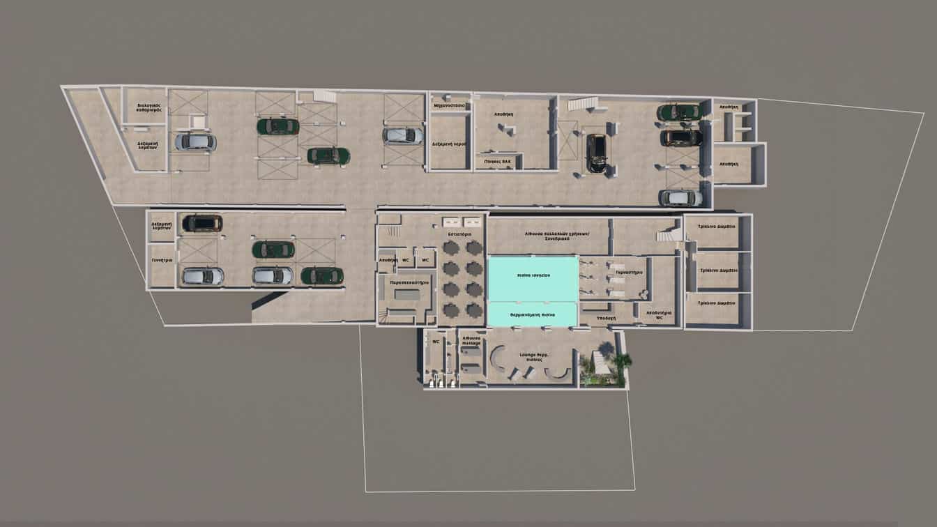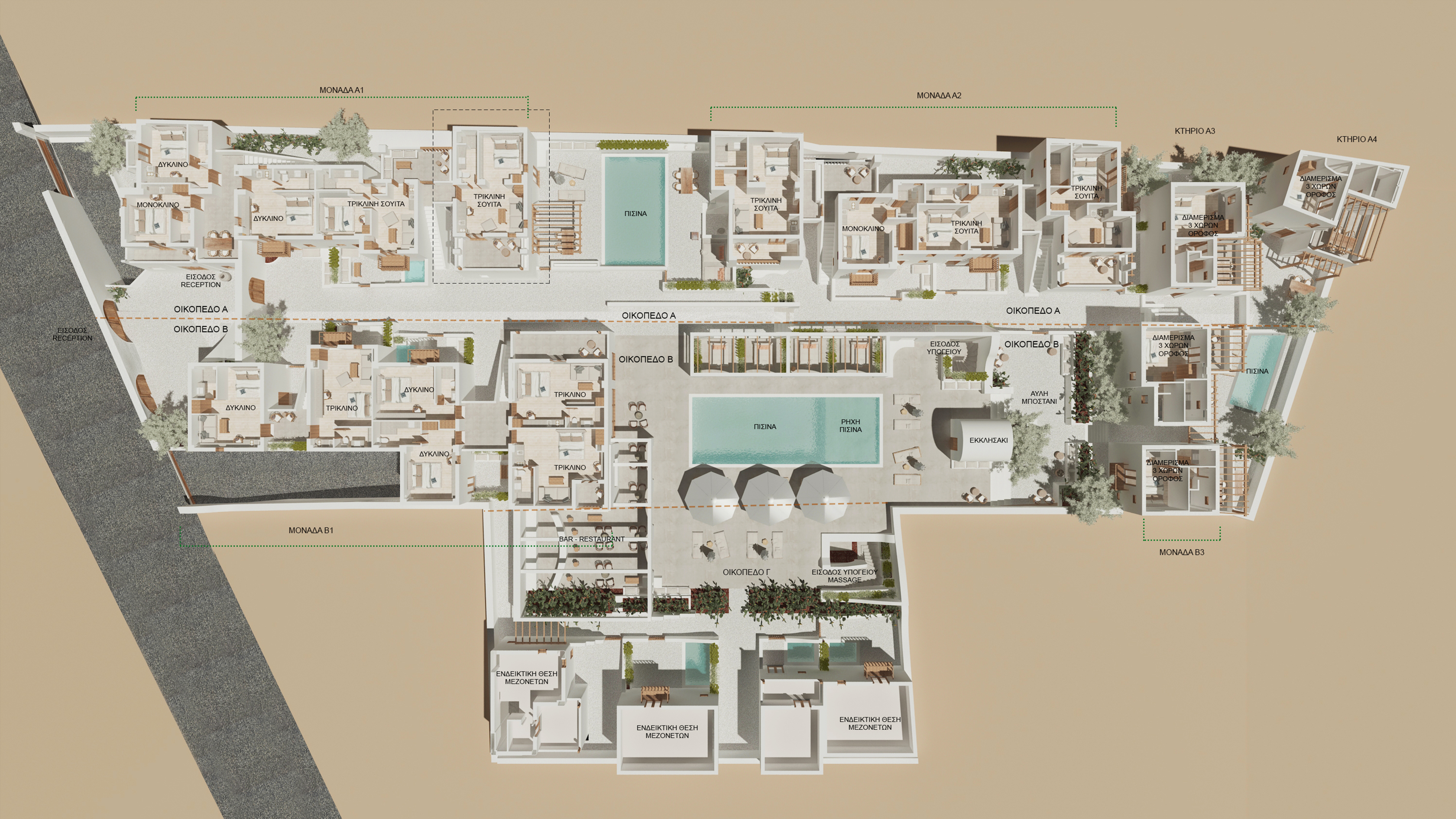 The relationship between the surrounding space and the building volumes, along with a large extension at the facing boundaries of the plot, strengthens the feeling of a settlement with ‘courtyards. Even the configuration of the surrounding space on 3 levels followed by the seating of the building volumes on 3 different levels respectively, structures an intense plasticity and inclusion in the natural relief, while maximizing the sense of community and human scale which is what is required in the synthetic resolution.