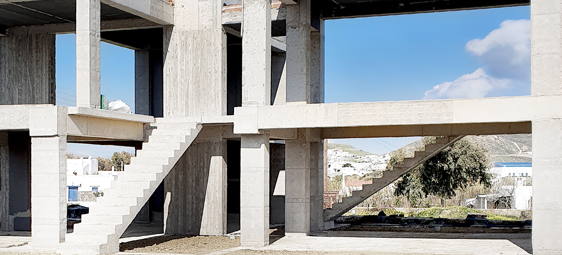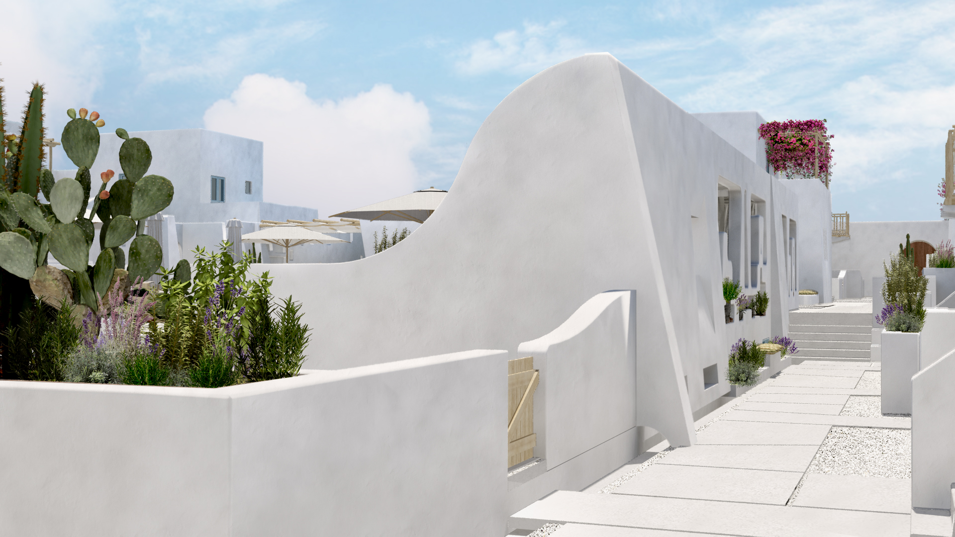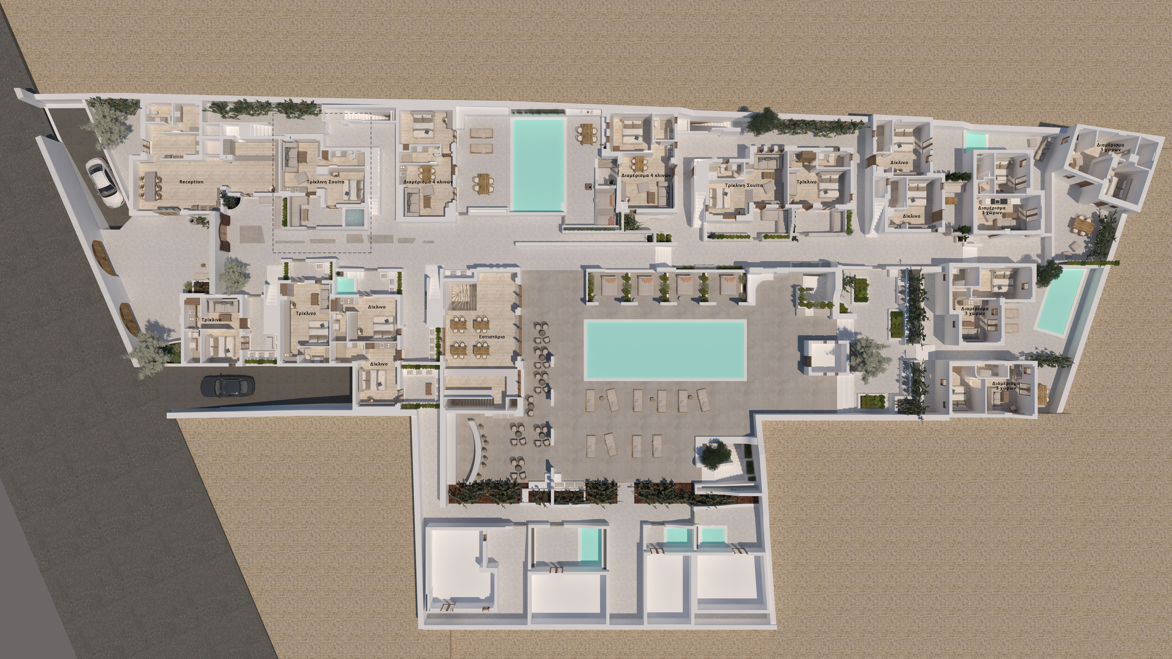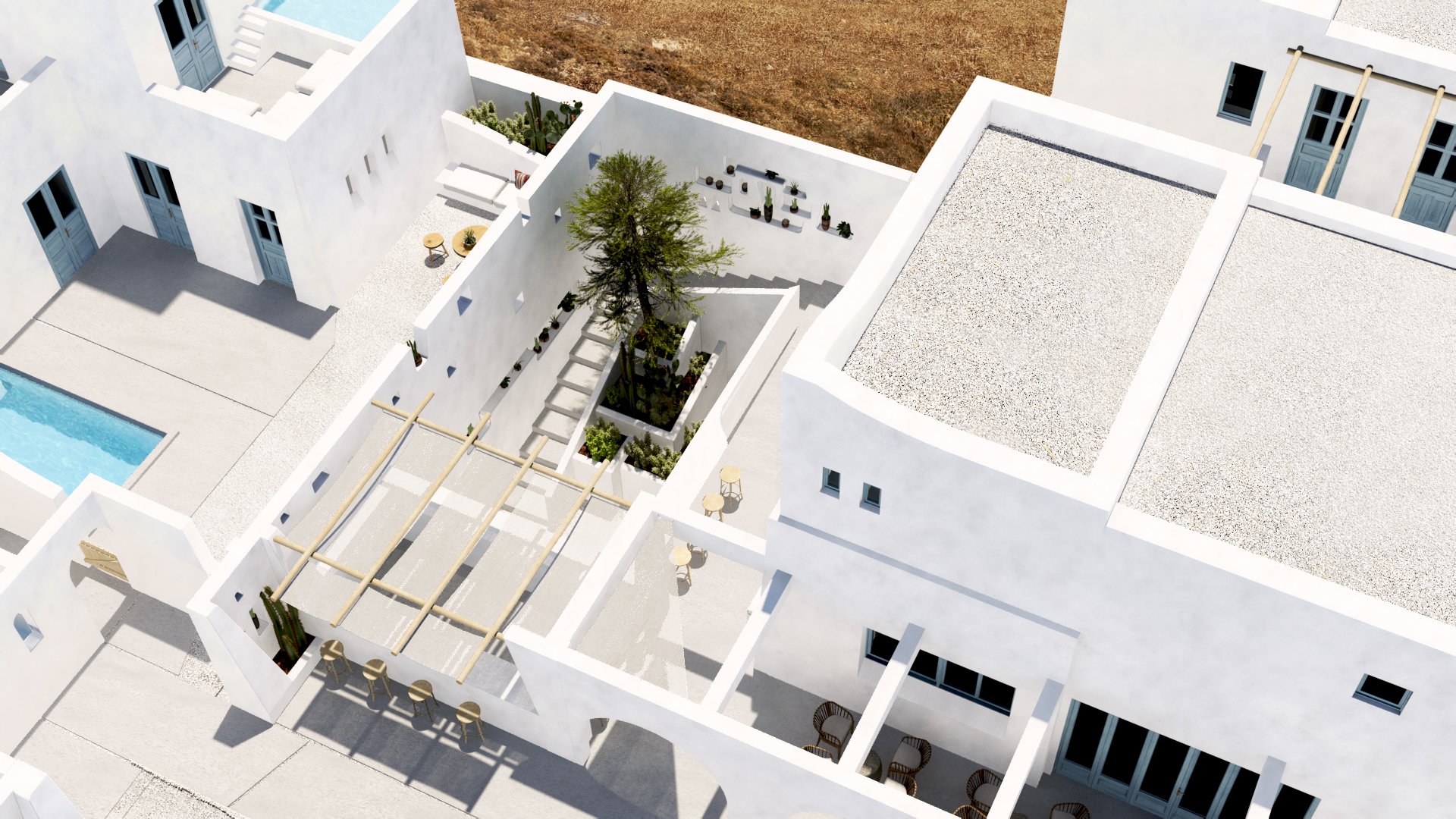The first and largest building volumes face the southern border of the plot, where a functional surrounding space is created. This inward-facing design is necessary due to the lack of an interesting view of the neighboring plots and buildings, as well as the surrounding environment. On the contrary, the last and smaller volumes direct their openings and their oncoplastic relaxation towards the south-eastern boundary of the plot with the aim of allowing the users to enjoy the view towards Kalo Livadi beach.