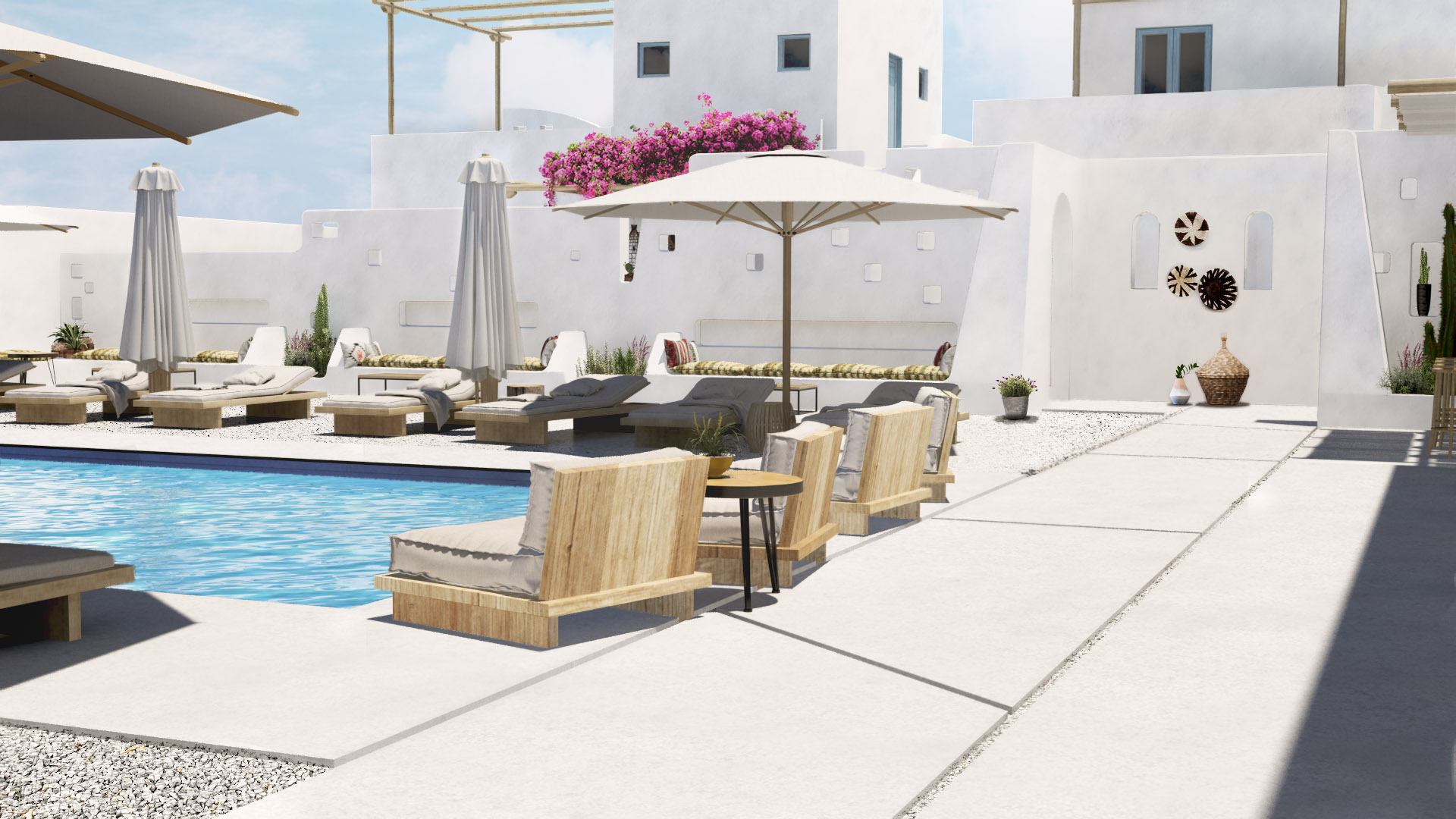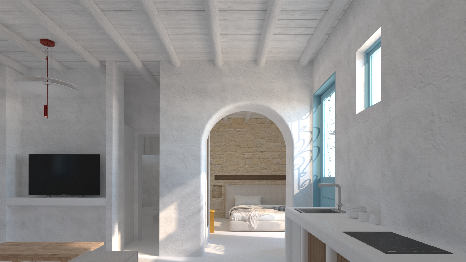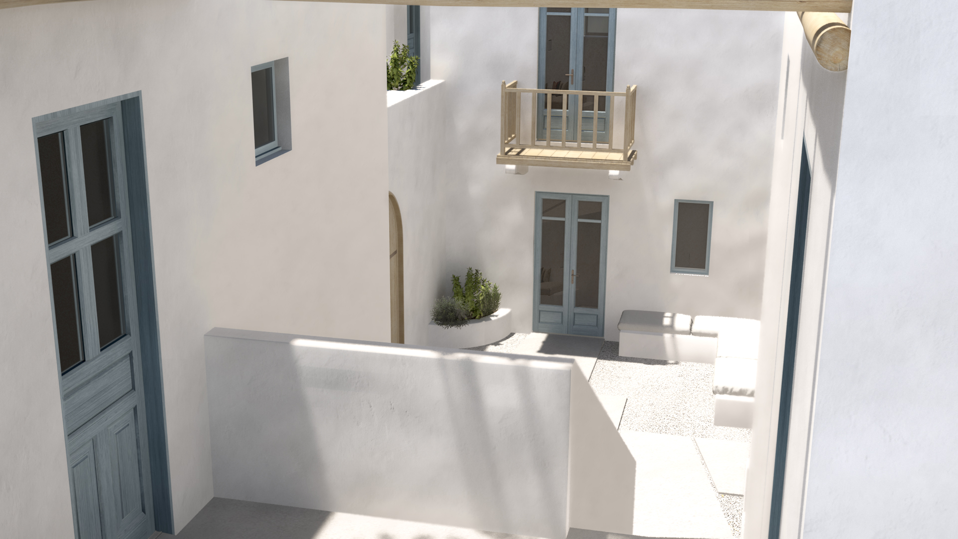 The first and largest building volumes face the southern border of the plot, where a functional surrounding space is created. This inward-facing design is necessary due to the lack of an interesting view of the neighboring plots and buildings, as well as the surrounding environment. On the contrary, the last and smaller volumes direct their openings and their oncoplastic relaxation towards the south-eastern boundary of the plot with the aim of allowing the users to enjoy the view towards Kalo Livadi beach.