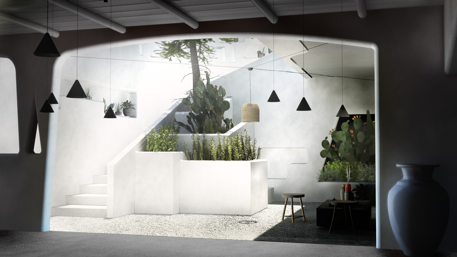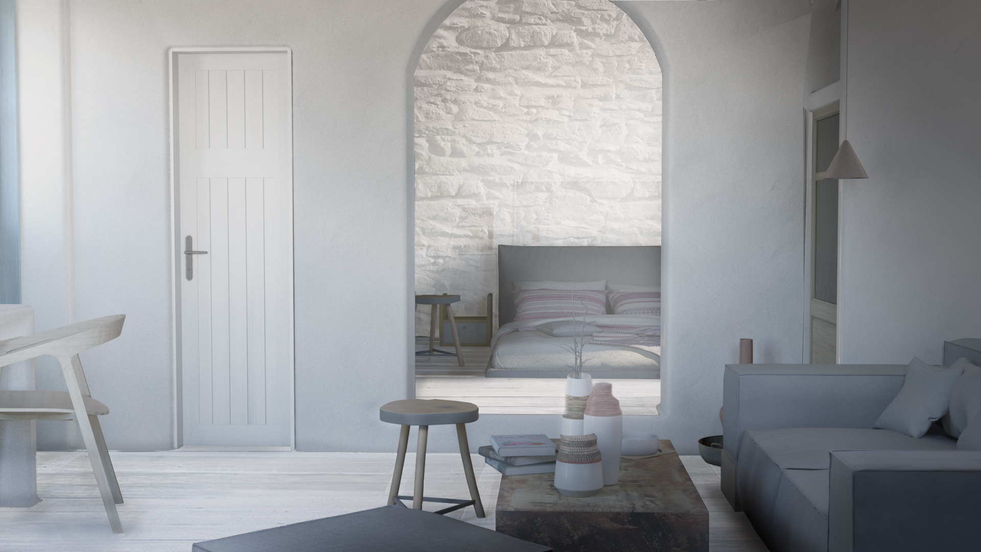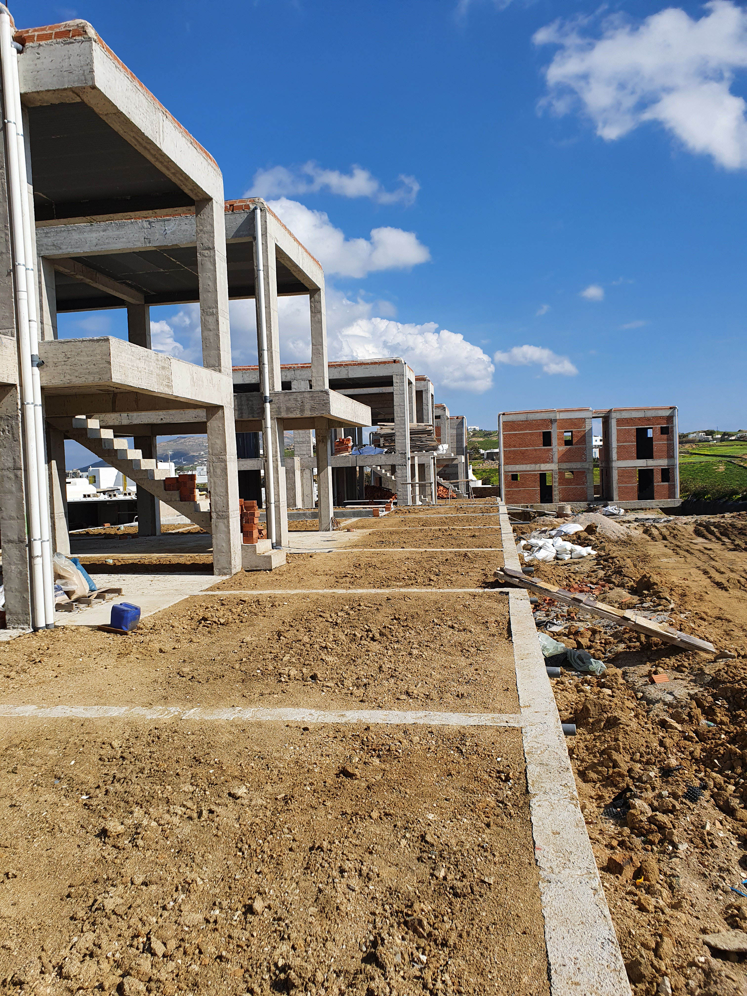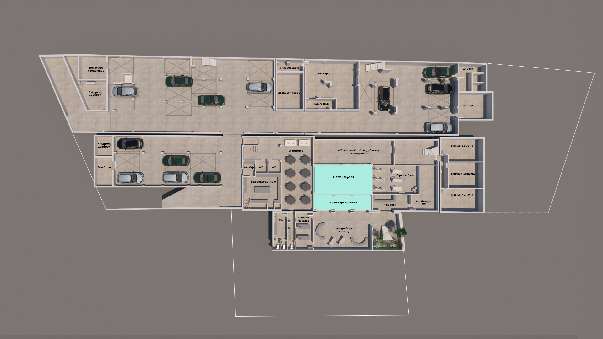 The first and largest building volumes face the southern border of the plot, where a functional surrounding space is created. This inward-facing design is necessary due to the lack of an interesting view of the neighboring plots and buildings, as well as the surrounding environment. On the contrary, the last and smaller volumes direct their openings and their oncoplastic relaxation towards the south-eastern boundary of the plot with the aim of allowing the users to enjoy the view towards Kalo Livadi beach.
