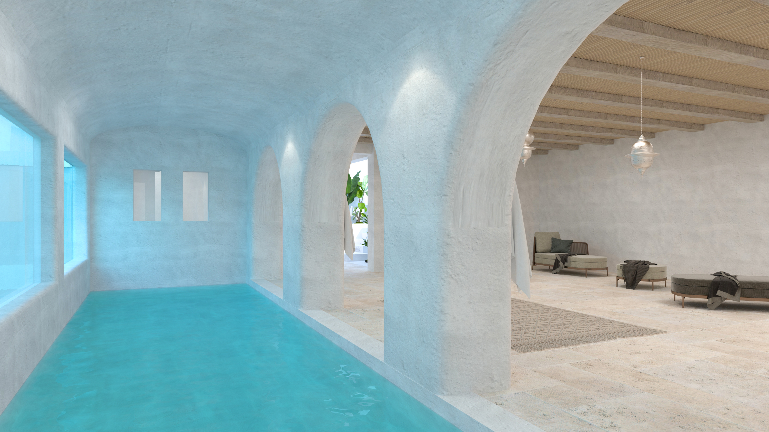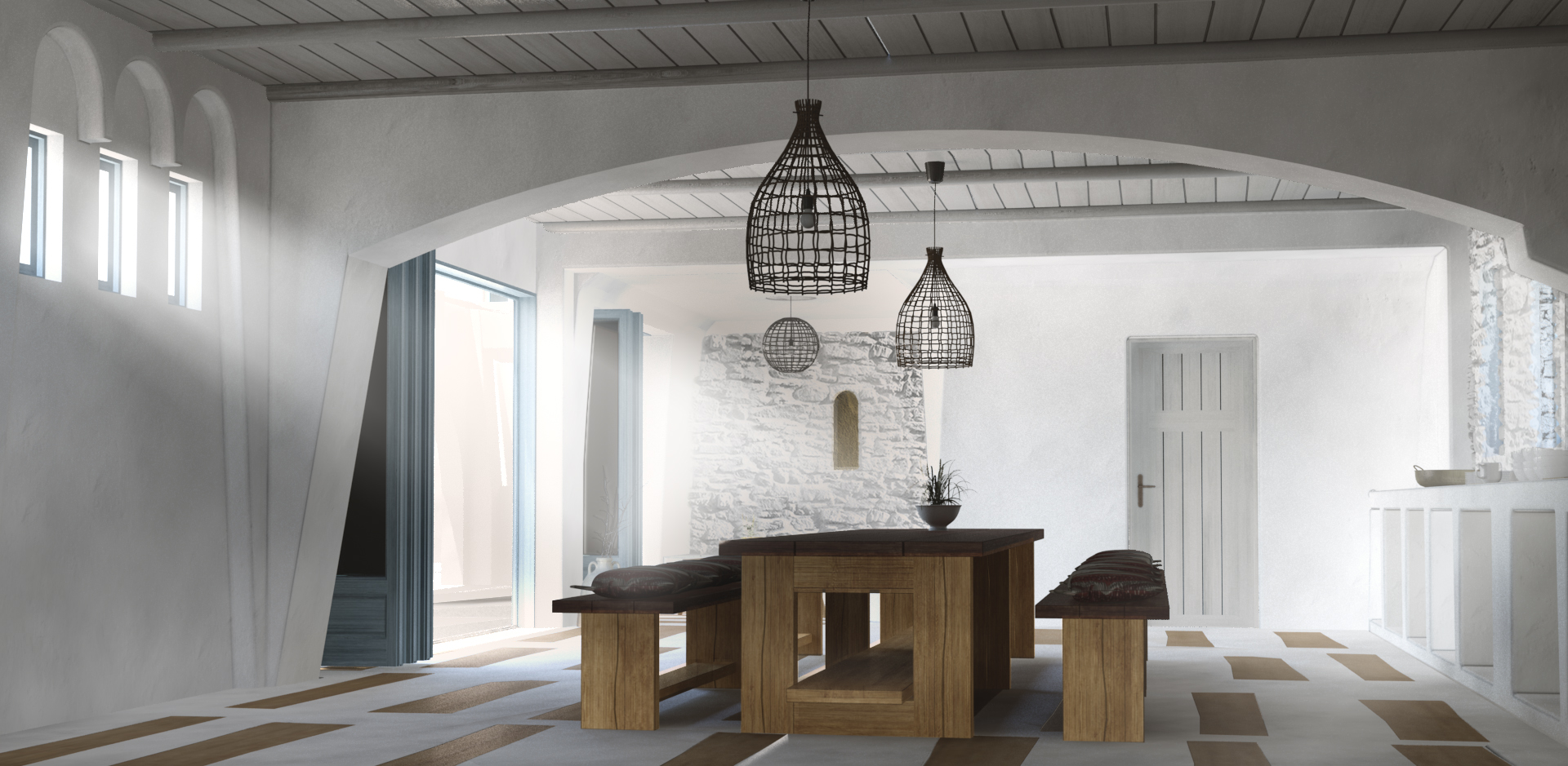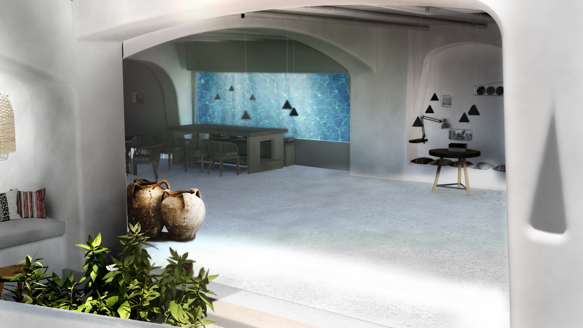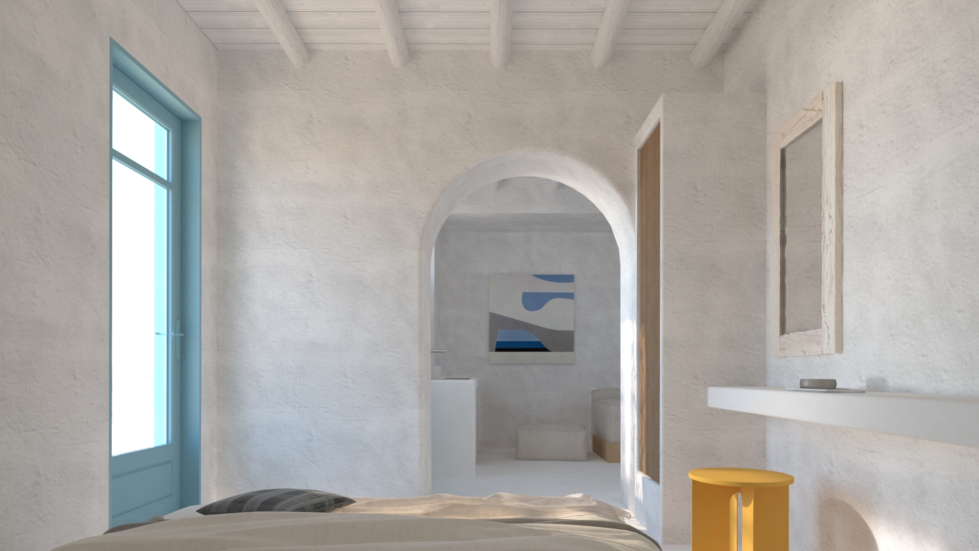Additional elements are the arches in the communal pool area as a reminder of the arches in the monastery of Ano Mera. Also, the external walled mantra of the facade is built with great height, creating even more strongly the feeling of a monastic type enclosed small settlement. Finally, in many internal brick mandras – mainly in the common area – transparent panels were studied with such a design as to refer to forms of Cycladic seats.