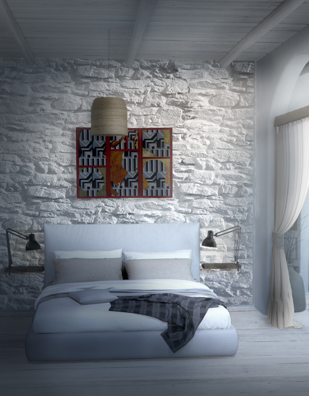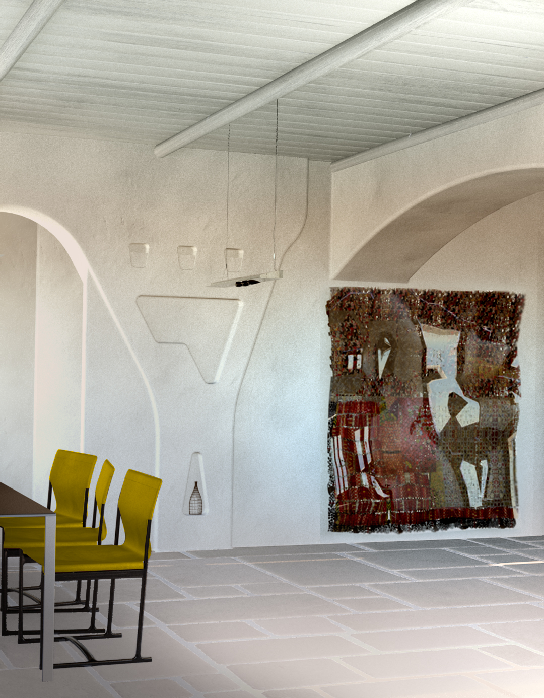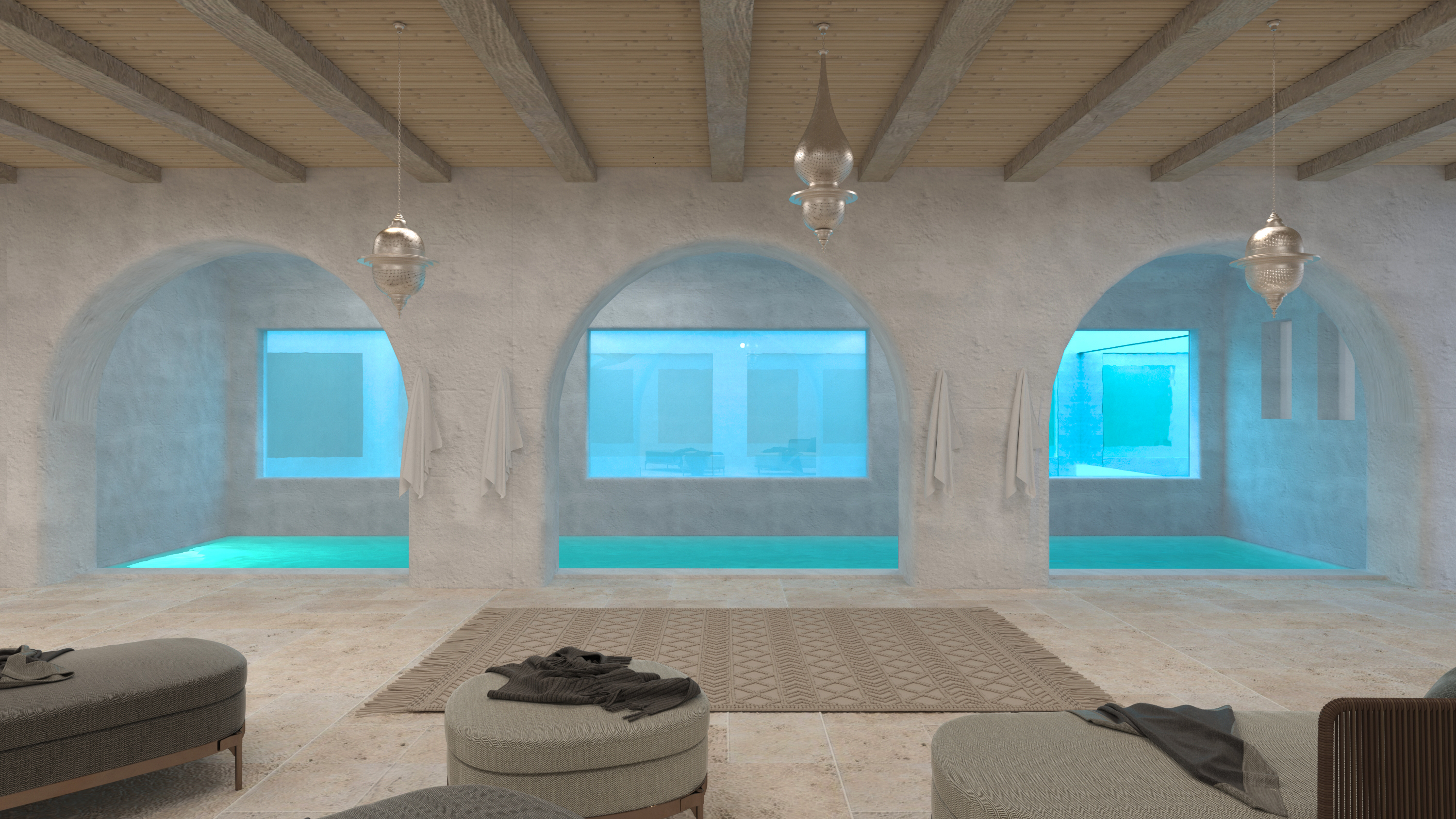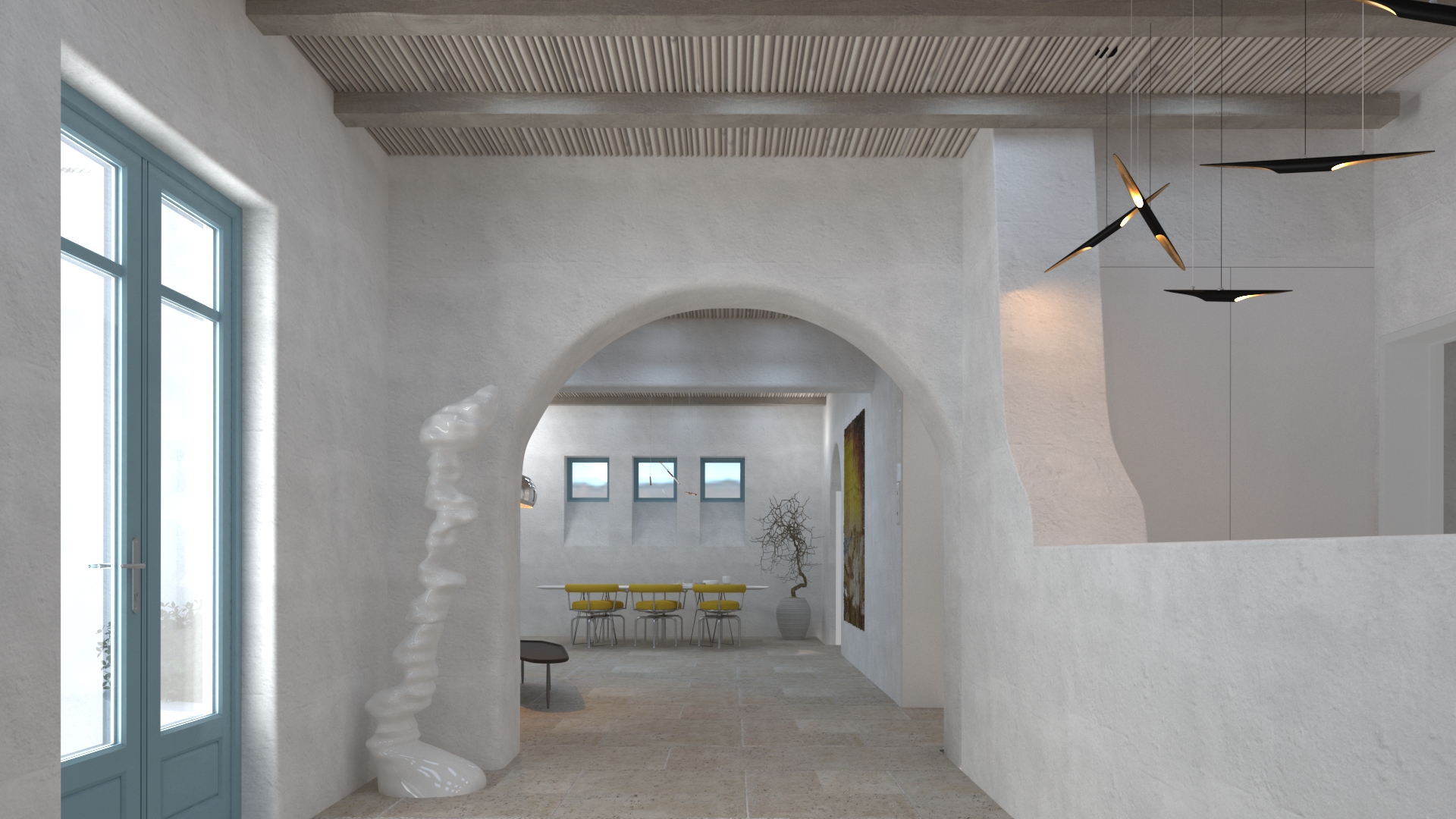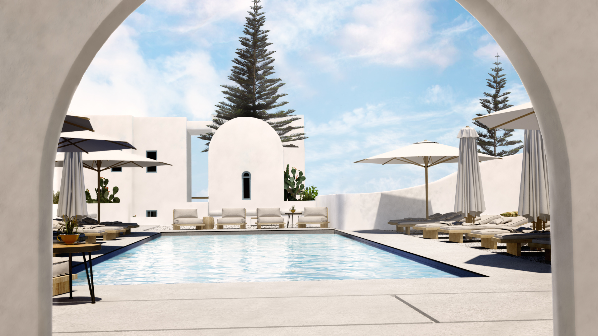 Additional elements are the arches in the communal pool area as a reminder of the arches in the monastery of Ano Mera. Also, the external walled mantra of the facade is built with great height, creating even more strongly the feeling of a monastic type enclosed small settlement. Finally, in many internal brick mandras – mainly in the common area – transparent panels were studied with such a design as to refer to forms of Cycladic seats.