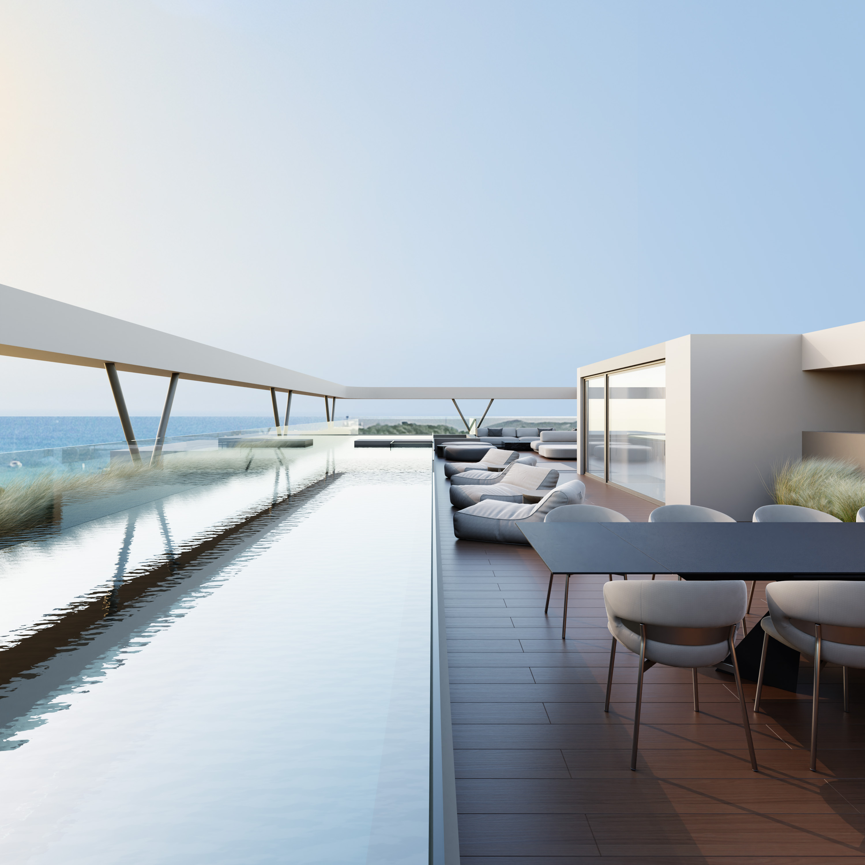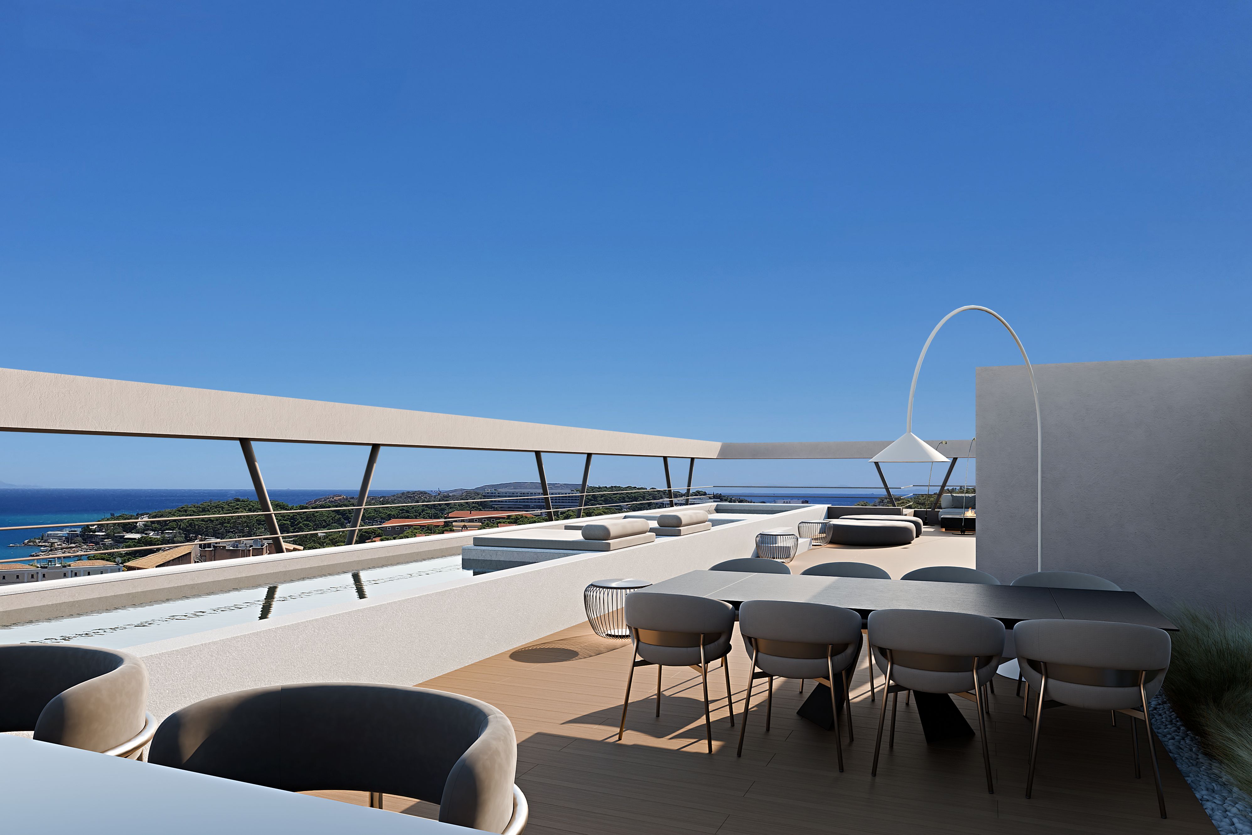 Furthermore, the creation of large openings on the facades ensures unobstructed views of the sea. The design of the rooftop was also a fundamental part of the proposal, as it offers unobstructed views in all directions.
