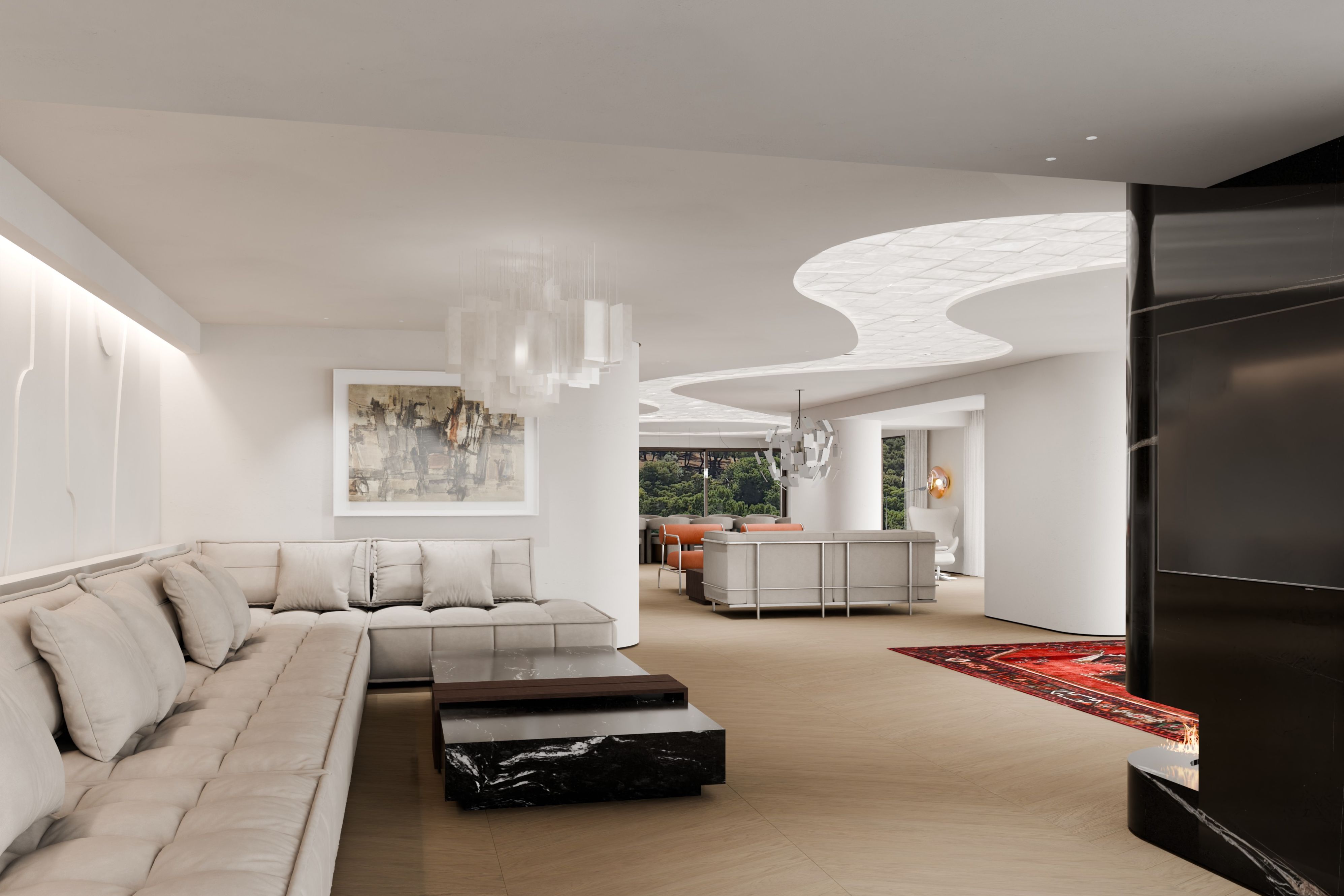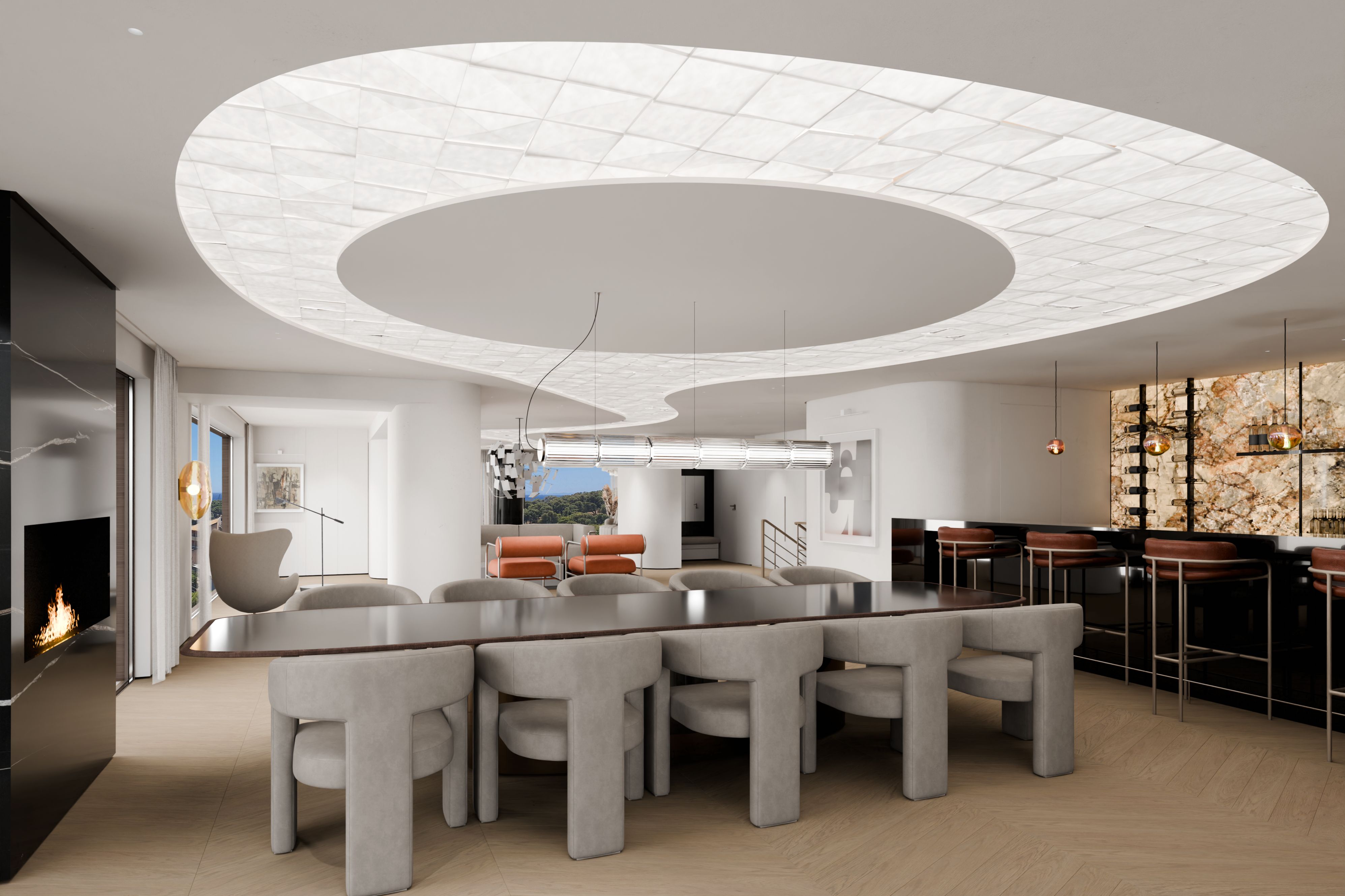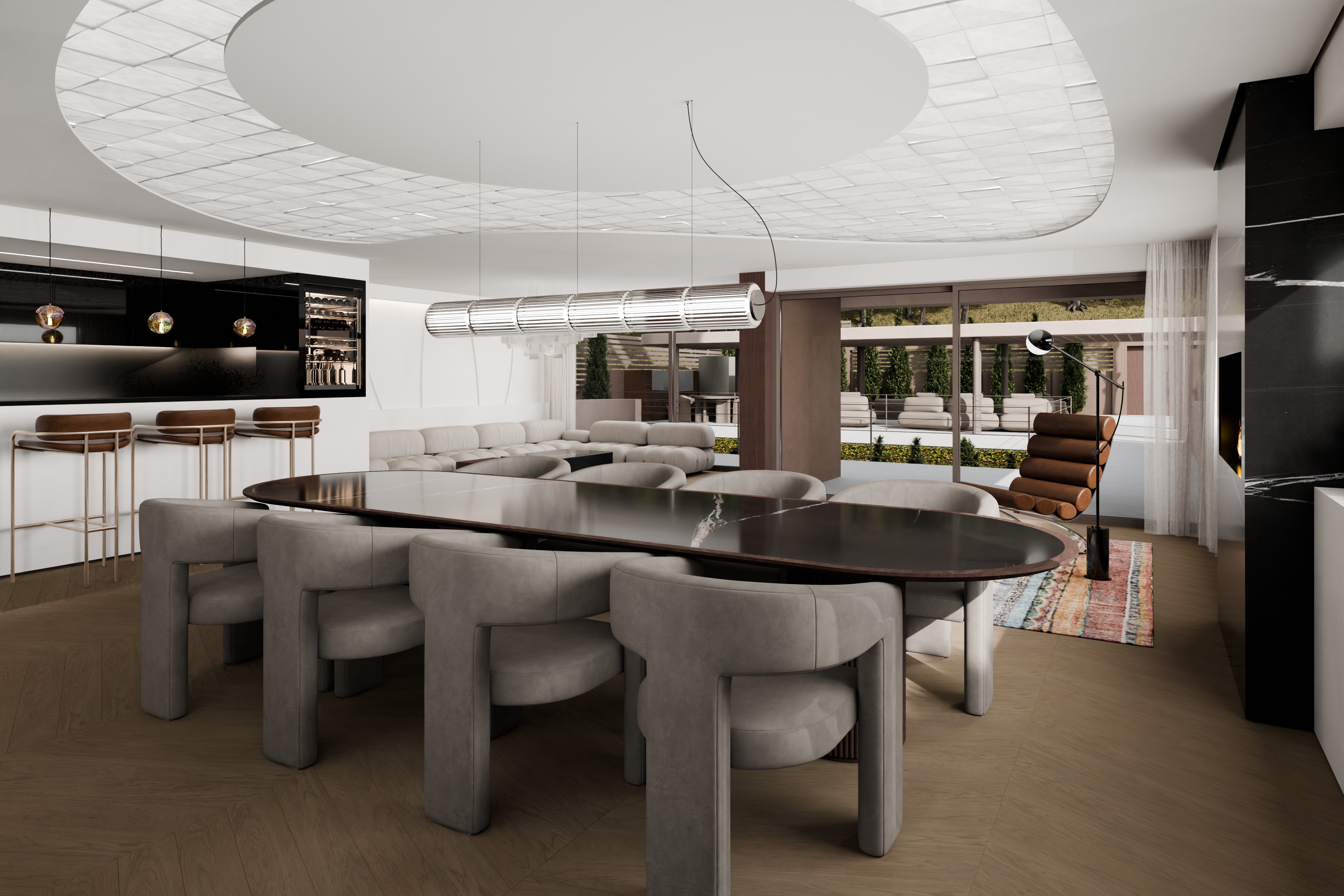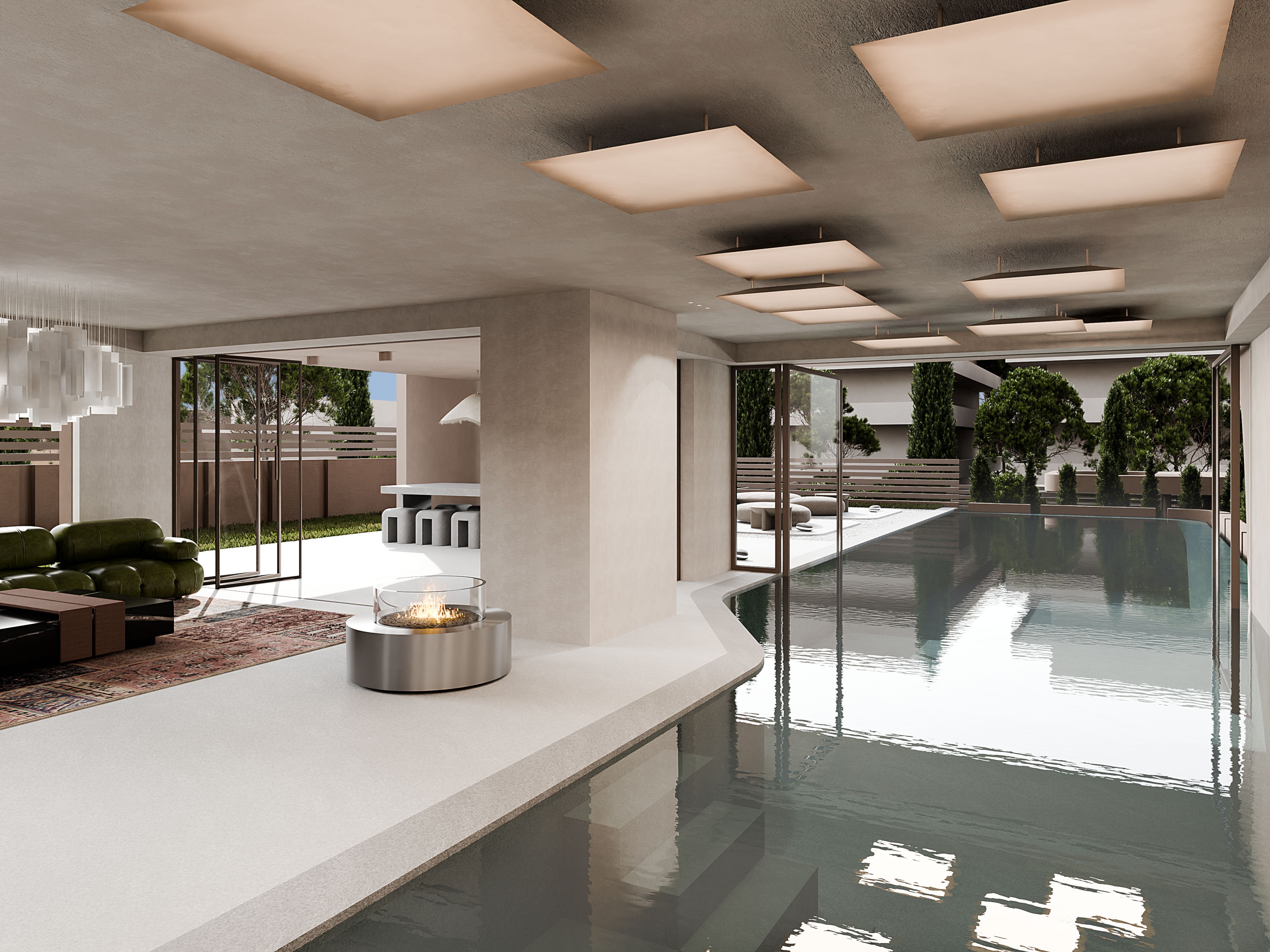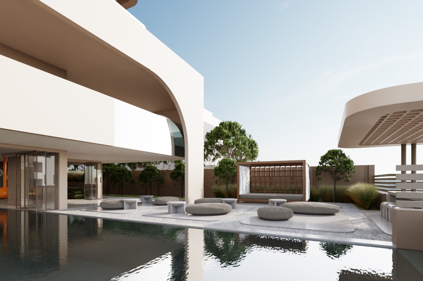The proposal involves completing part of the basement according to the building permit, along with additional modifications to the internal layouts, alterations to the facades and surrounding areas, as well as the addition of swimming pools in the pilotis, the courtyard on the second floor, and on the rooftop.