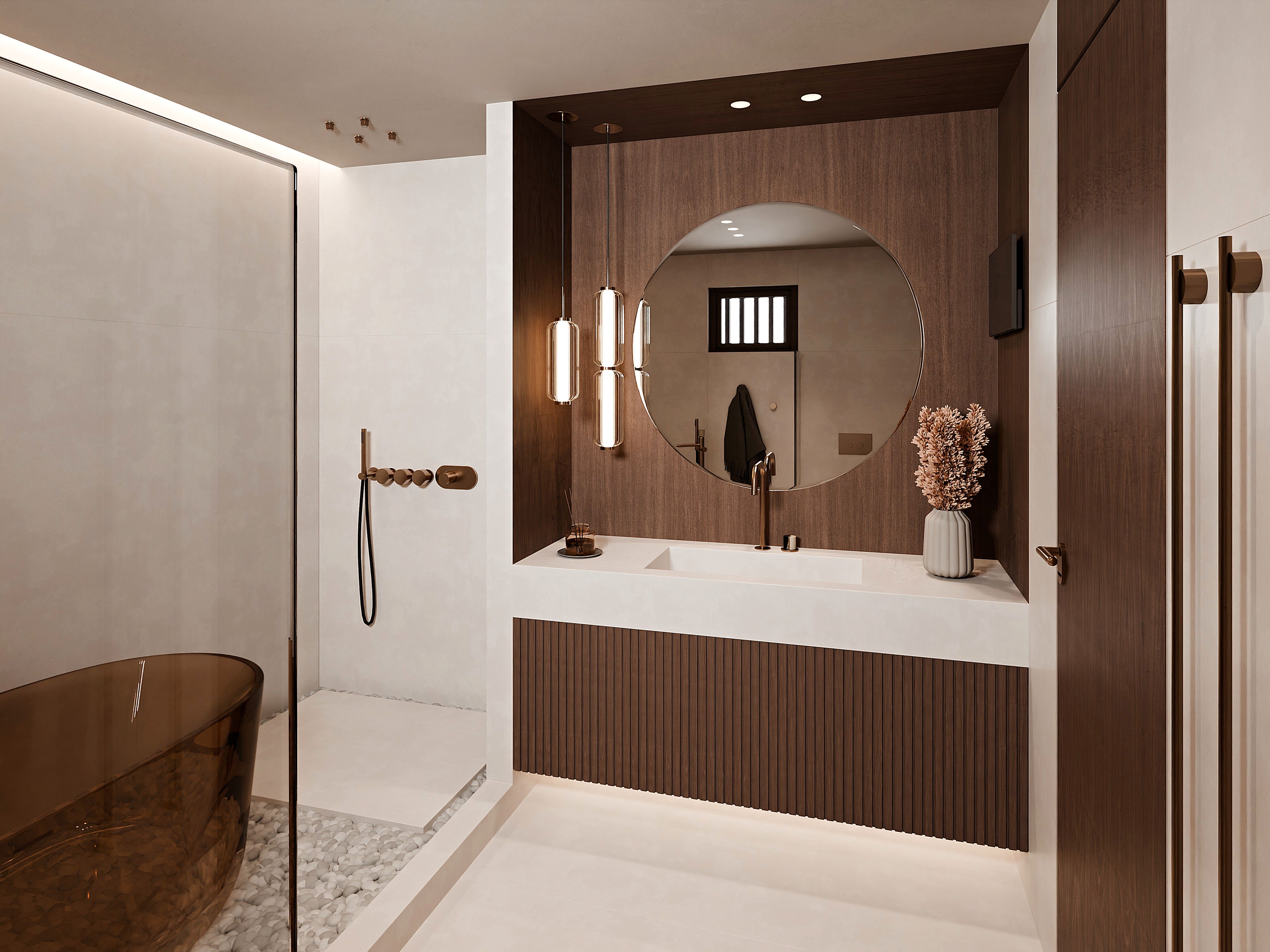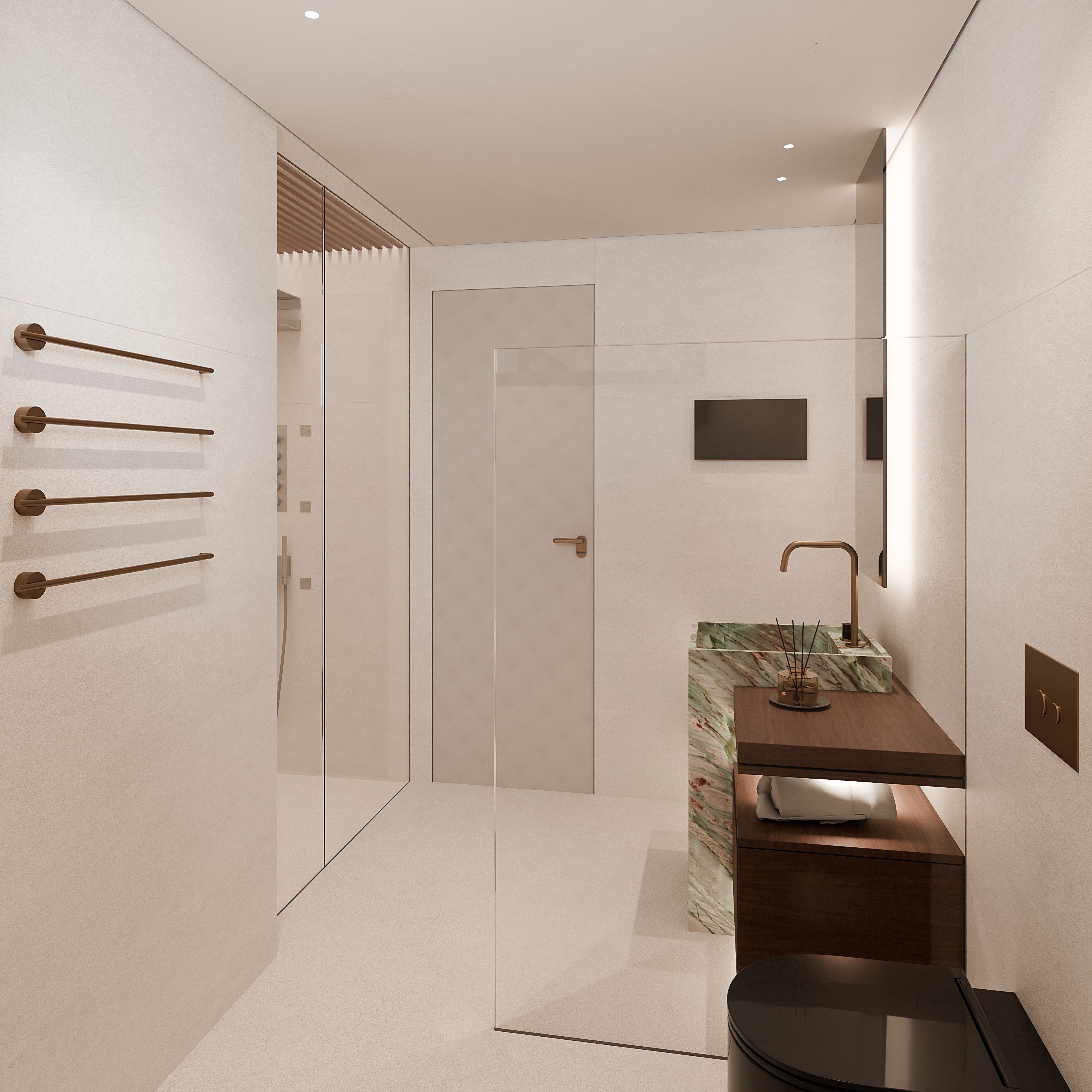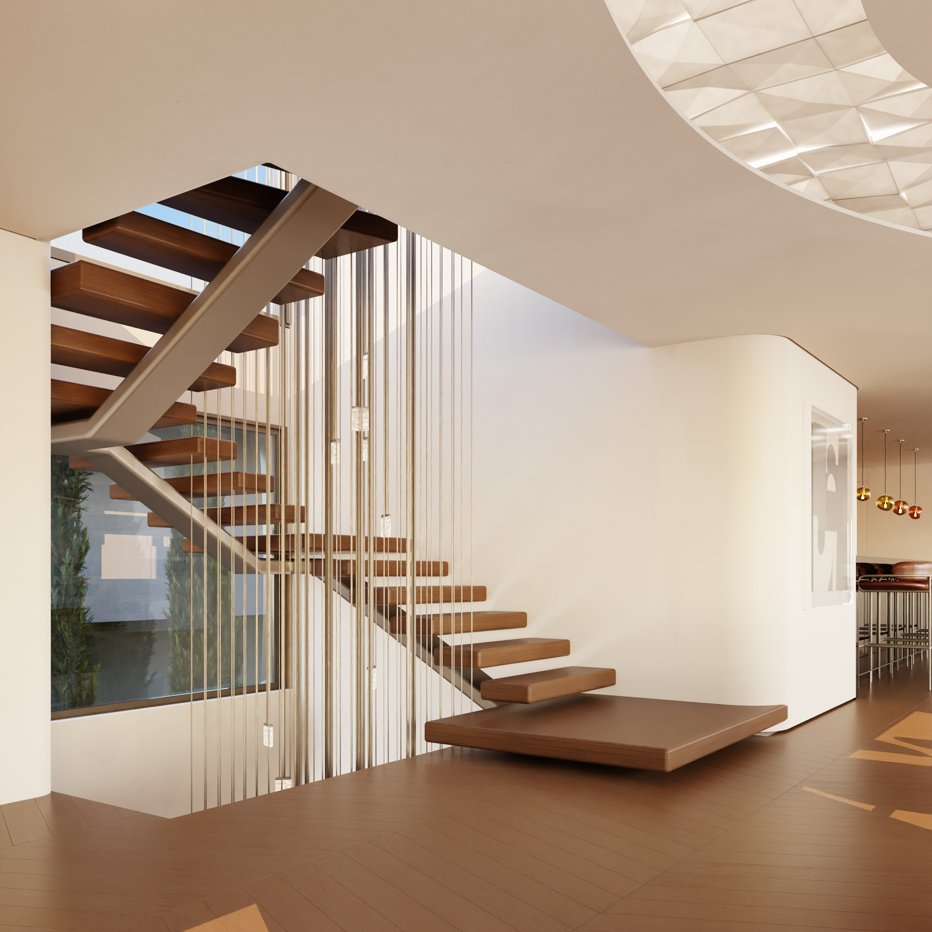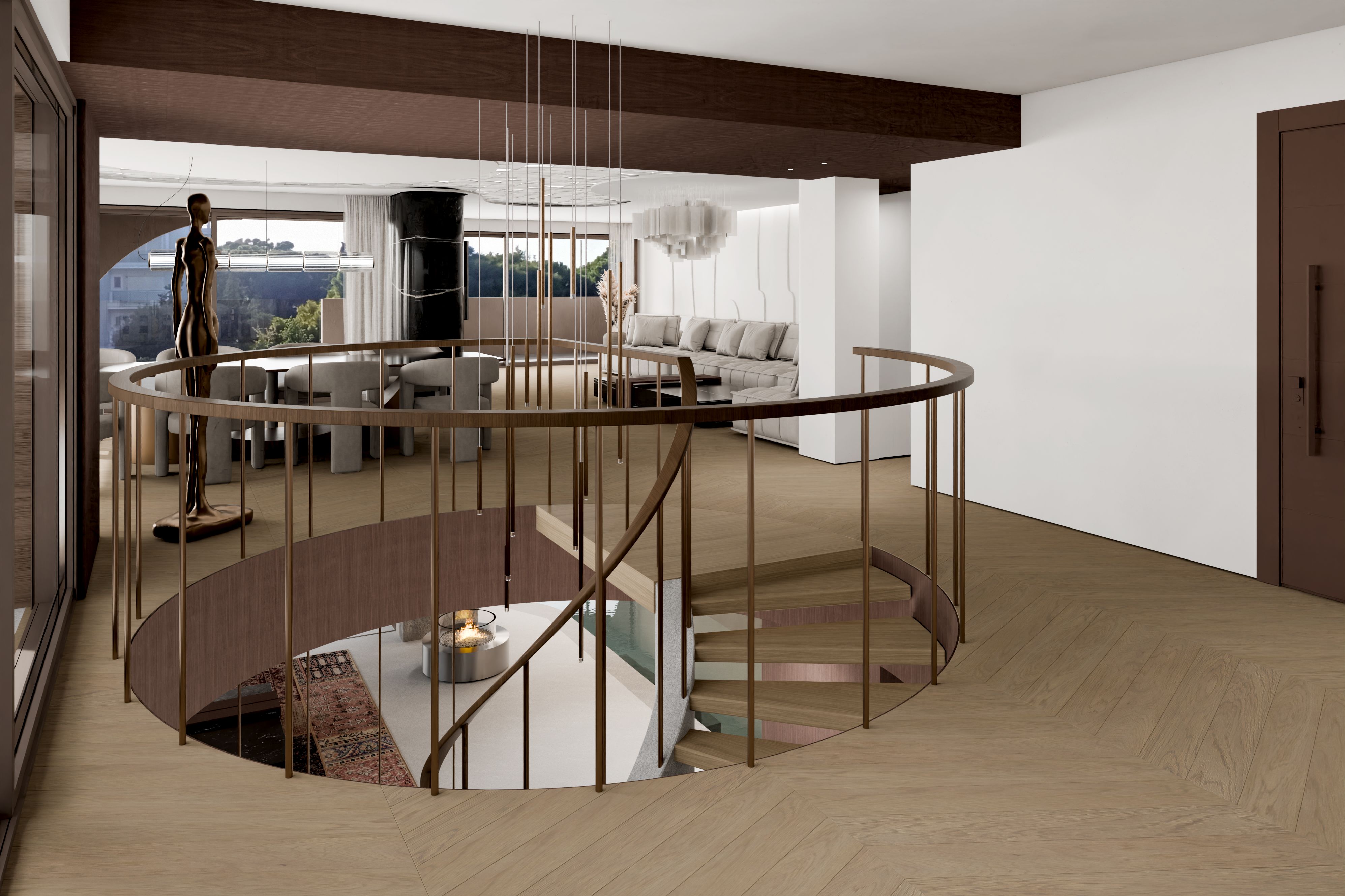 The window frames are made of light brown aluminum. Glass railings are designed, as well as metal elements in a light gray and warm off-white finish. The walls of the landscaped exterior areas are made of reinforced concrete with a final plaster finish in warm off-white. The exterior floors are proposed to be white marble sandblasted with decorative pebbles. Inside, large oak surfaces in a French herringbone pattern dominate. Additionally, metal canopies in a warm off-white finish are installed for shading in the landscaped atrium spaces of the ground floor-pilotis and the second floor.