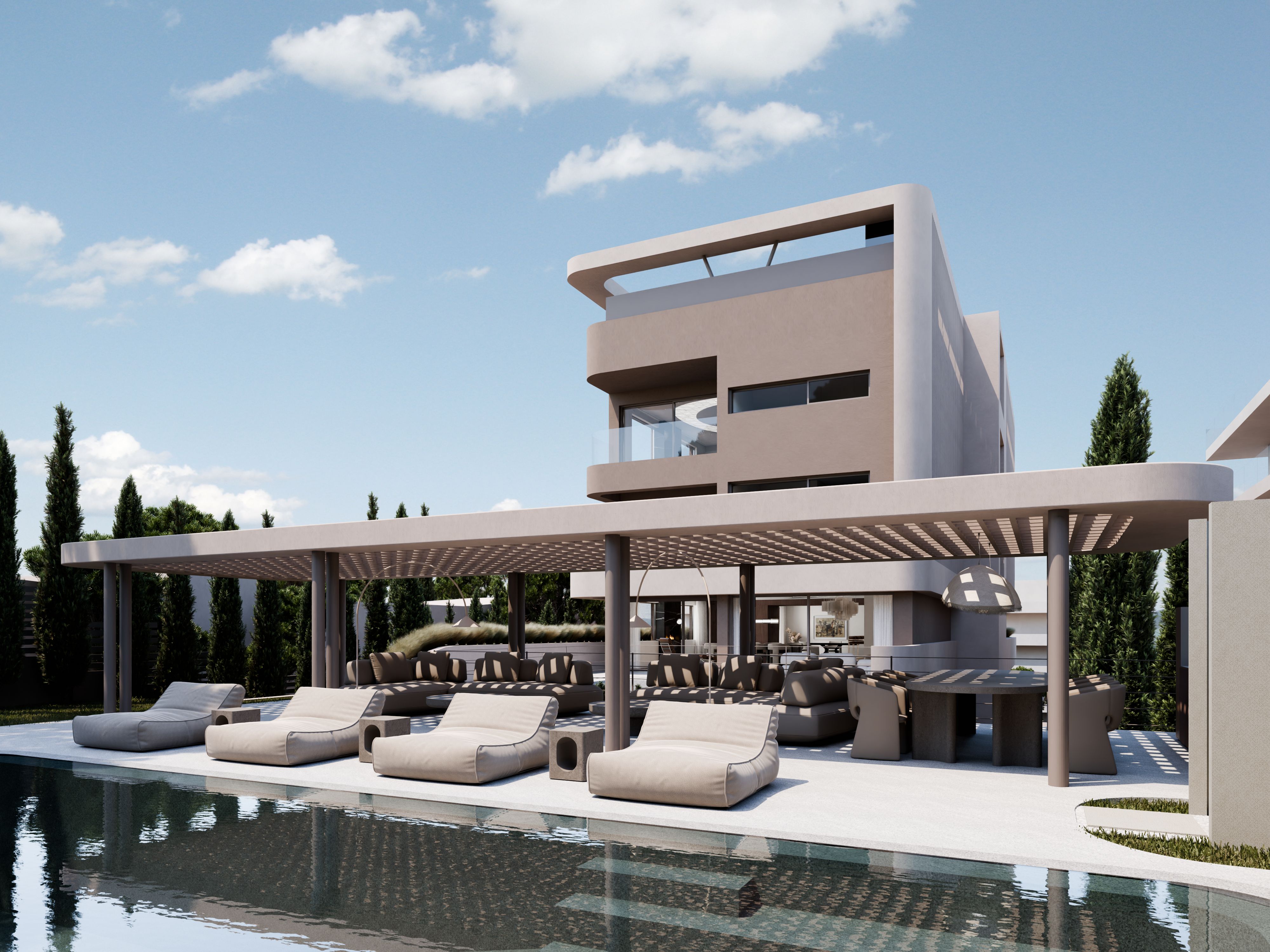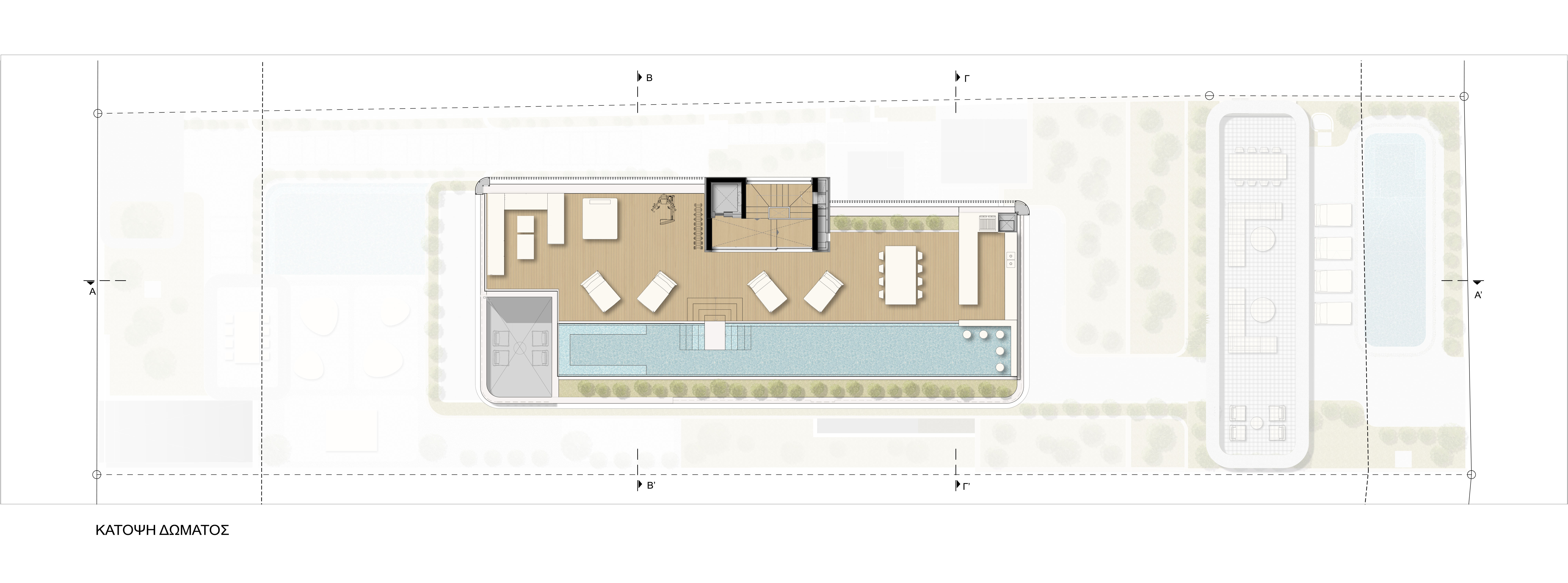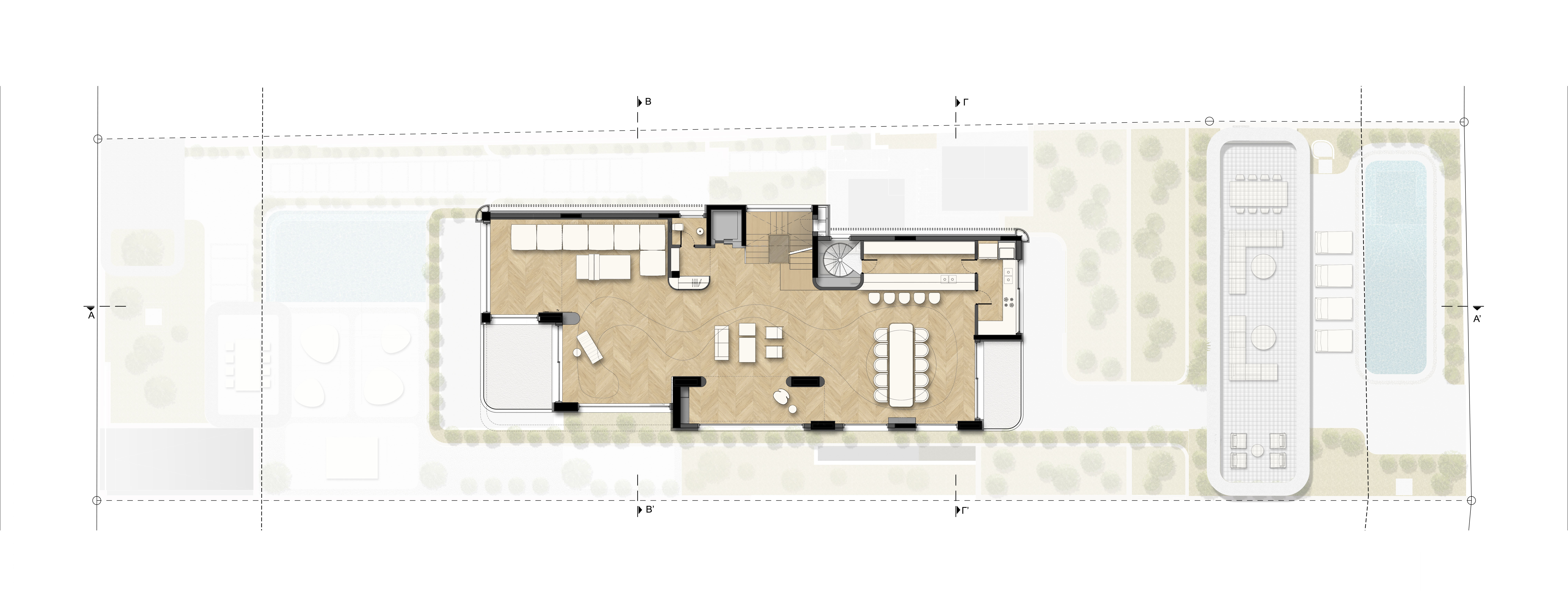 the rear atrium, while the first maisonette integrates the ground floor-pilotis with the first floor, and the second maisonette integrates the third floor with the fourth floor and the rooftop. Each apartment/maisonette features a shared living, dining, kitchen, and WC space, along with master bedrooms with private bathrooms. Each apartment also has a private landscaped outdoor area with a swimming pool, a sitting area, kitchen/barbecue, and dining/bar space.