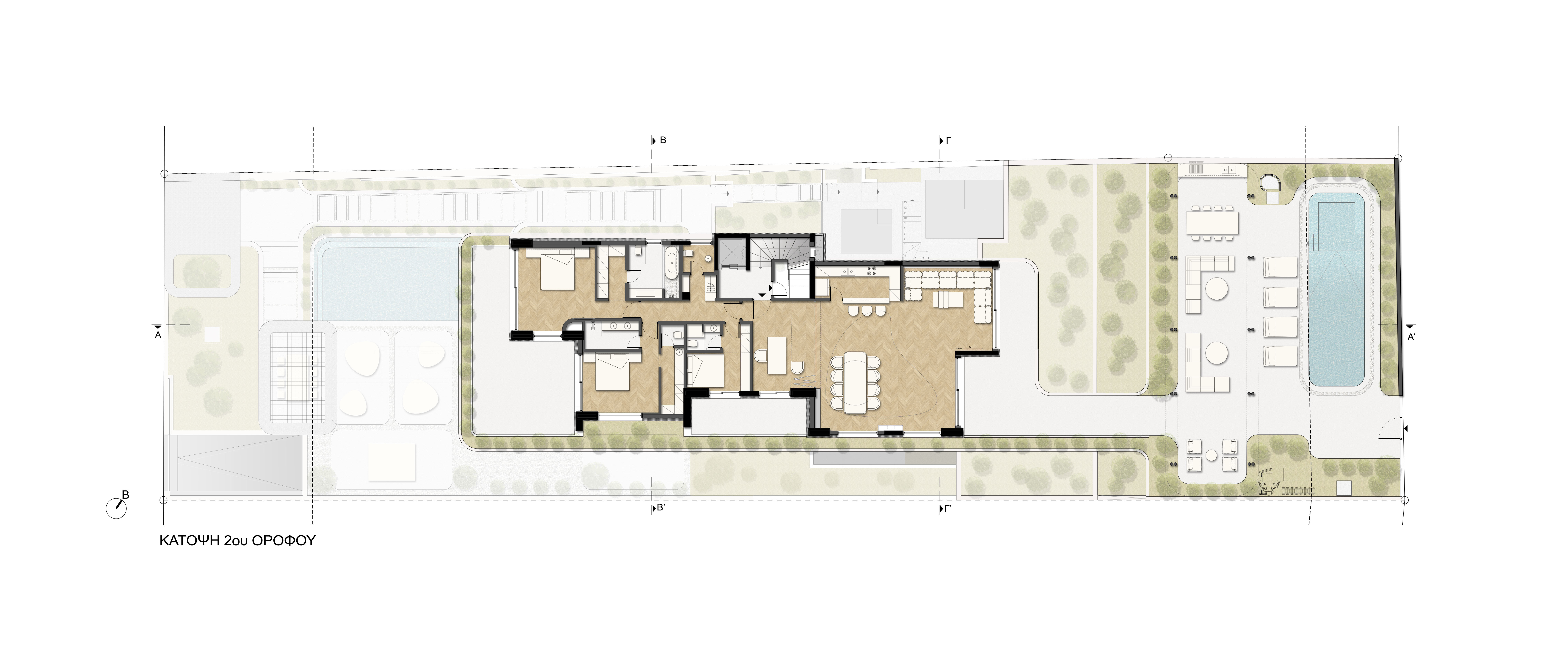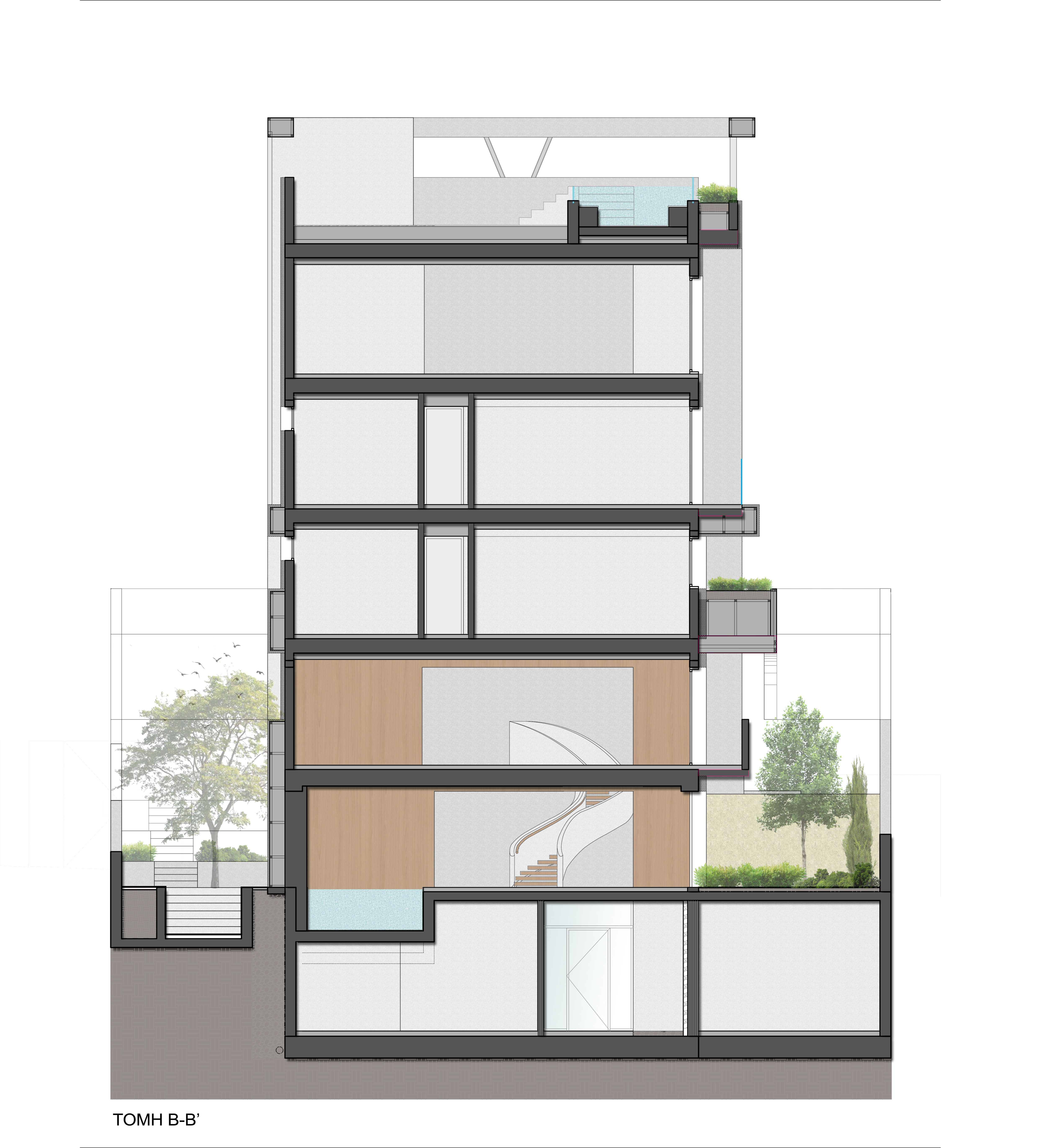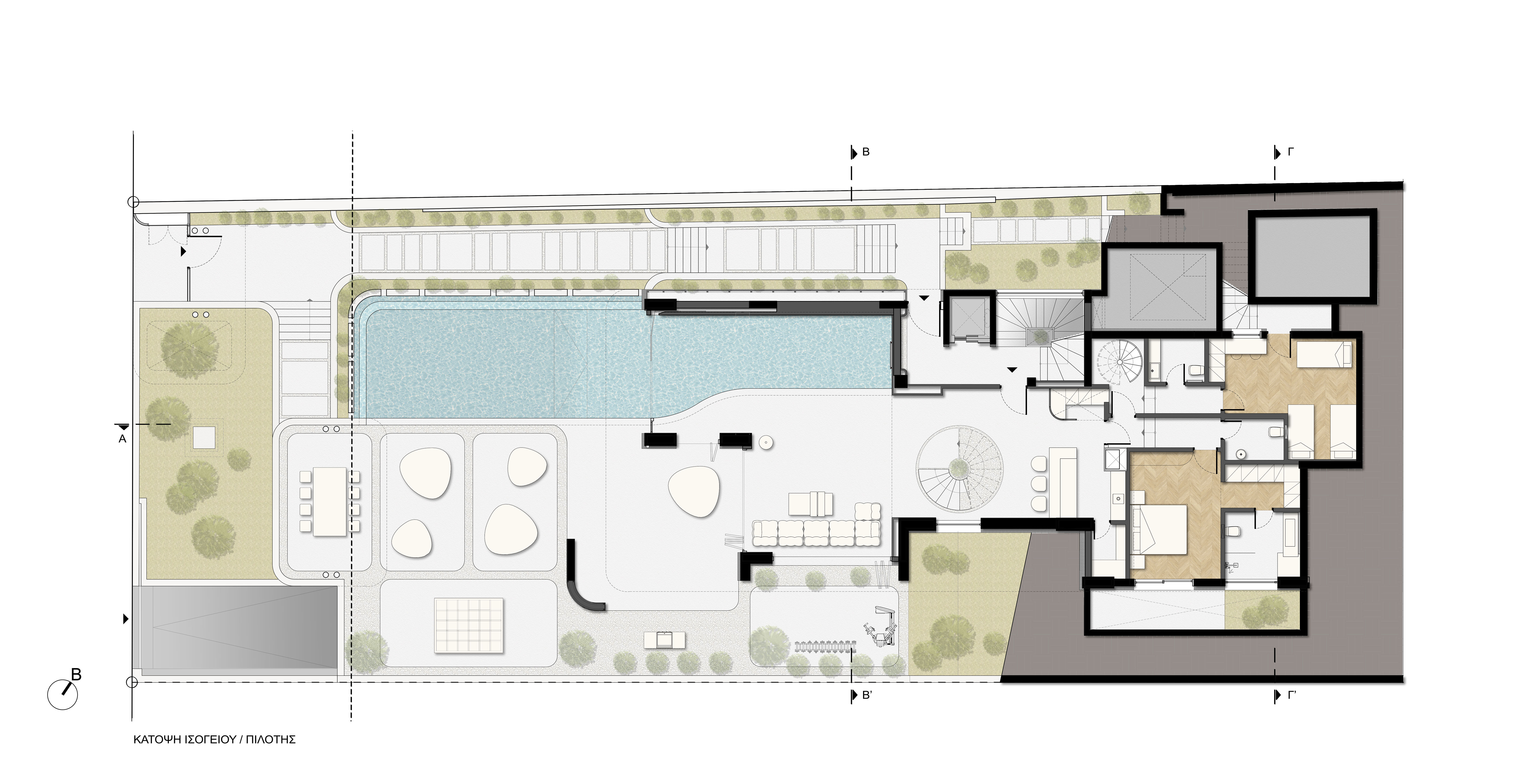 the rear atrium, while the first maisonette integrates the ground floor-pilotis with the first floor, and the second maisonette integrates the third floor with the fourth floor and the rooftop. Each apartment/maisonette features a shared living, dining, kitchen, and WC space, along with master bedrooms with private bathrooms. Each apartment also has a private landscaped outdoor area with a swimming pool, a sitting area, kitchen/barbecue, and dining/bar space.