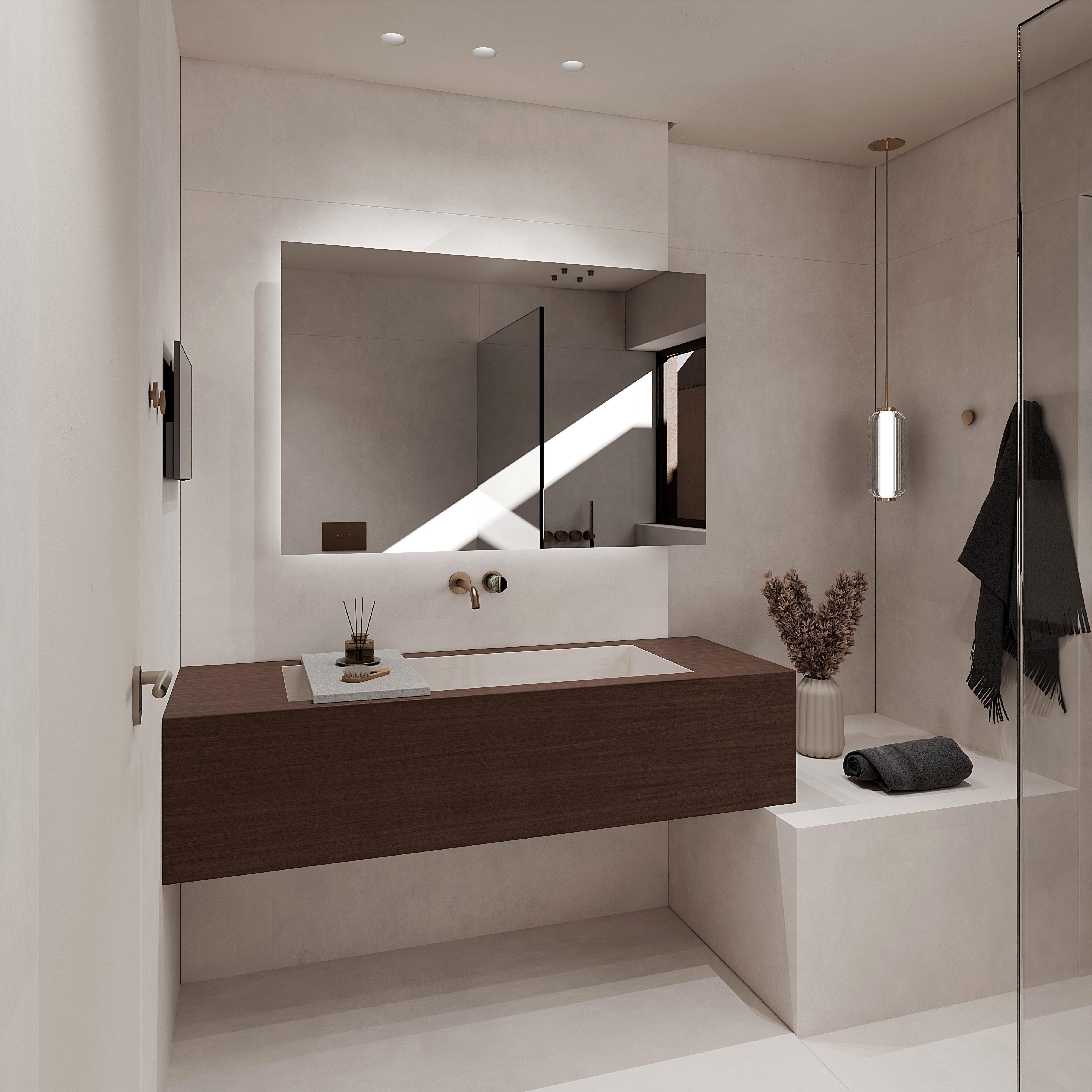 The materiality and color palette consists of the following: The main building volume is covered in a light brown plaster, while the architectural projections are covered with a warm off-white plaster.